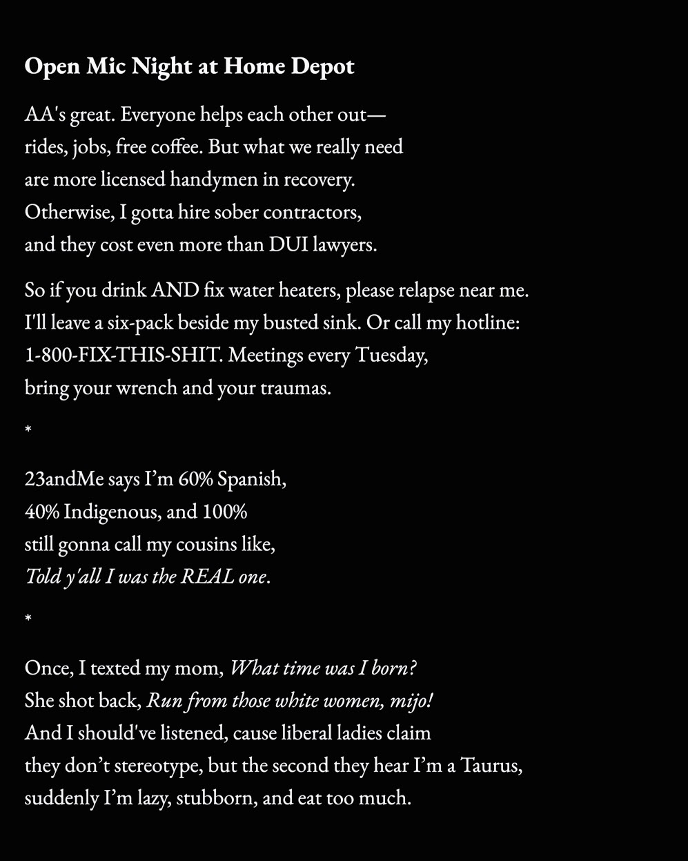 —Jose Hernandez Diaz, NEA Poetry Fellow and author of Bad Mexican, Bad American.